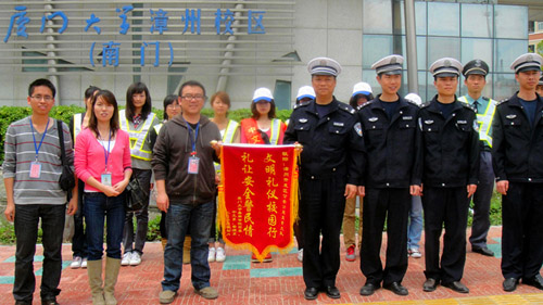 随后,学工部副部长刘丰、中文系和管理系行政秘书兼辅导员郑育琛和郭艺伟一同为漳州开发区交警大队献上锦旗表示感谢。
