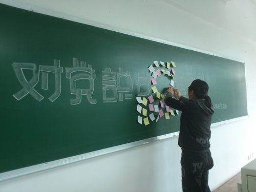 在李婧老师的提议下,党支部全体党员纷纷挥动手中的笔杆,将自己心中最想对党表达的情感写在纸片上,并依次贴在黑板上。随后,多名党员代表分别从不同角度分析了党成立90周年以来带给我们的变化,并结合自身学习、工作情况和党支部其他成员进行了深入的交流与探讨。