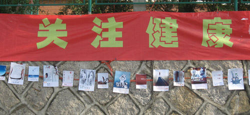 5月27日晚,国际经贸系学生第一党支部的成员们在南区食堂门口忙碌着,将心理图片悬挂展示出来。这是本学期该支部立项活动中的一个子活动,主要向全院同学宣传有关心理健康的图片,倡导健康生活,从“心”开始。