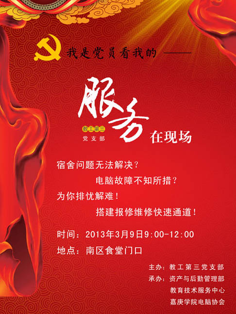 3月9日上午,教工第三党支部的老师协同电脑协会的同学们来到南区食堂门口,摆起了摊,修起了电脑、登记学生报修的宿舍问题,忙得不亦悦乎。