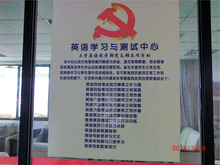 该立项活动时间为单周周一下午15:00至16:00 , 双周周二上午10:00至11:00,地点设在经管大楼六楼教师休息室,即英语学习与测试中心。该中心辅导内容包括大学英语四六级听、说、读、写技巧指导,雅思英语考试技巧指导,英语演讲口才技巧点拨,英语话剧表演指导,英语电影及电视剧赏析与口语学习指导,英语电影配音技巧指导等多项技巧指导。