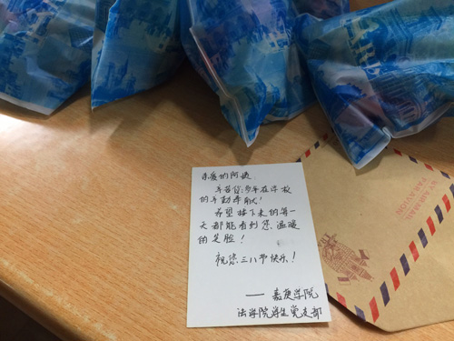 3月8日,在“三八”国际妇女节到来之际,法学院学生党支部为校区北、中、南三个的食堂130名食堂阿姨送去了温暖的礼物与真挚的祝福。