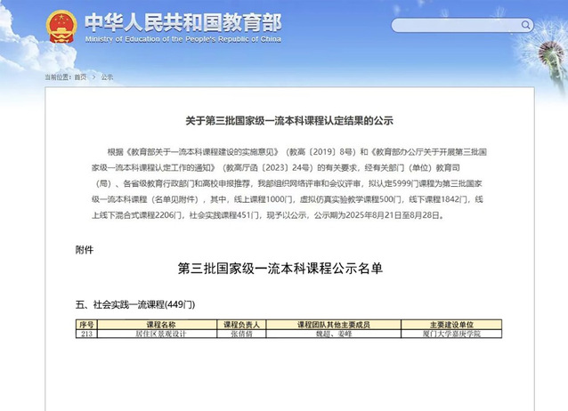 2025年12月,张倩倩、魏超、姜峰团队的《居住区景观设计》课程被认定为国家级社会实践一流课程。设计与创意学院坚定落实党的教育方针,紧扣立德树人根本任务,秉持“注重个性、力求多元、能力主导、踏实创新”的设计人才培养理念,教学科研成果丰硕。学院拥有福建省一流专业建设点1个,省级特色专业建设点1个,近年来获省级以上科研项目二十余项,并在2024年、2025年连续获教育部人文社会科学研究规划基金项目及文化和旅游部艺术学项目立项。2025年6月,学院成立闽南文化遗产活化研究中心。2025年1月,在美国IDA国际设计大奖(International Design Awards)2024年度评选中,叶茂乐教授带领的闽台乡村设计与创意研究中心团队设计作品《云顶庄园》,在全球80多个国家和地区的众多参赛作品中脱颖而出,荣获银奖。2025年7月,学院师生团队作品《梦溪寻踪——探索古代物理文化的奥秘》《墨秤挑天灯·光磁万象》荣获第18届中国大学生计算机设计大赛二等奖和三等奖。第十三届(2024)中国金点工业设计奖大赛,产品设计专业2022级学生林佳怡的作品《家庭露营行李箱设计》荣获产品组三等奖,并斩获十万元奖金。学院多位教师入选2024中国知网高被引学者名单,程永胜教授和徐骁琪副教授荣膺设计学领域Top1%,唐刚副教授位列Top5%。